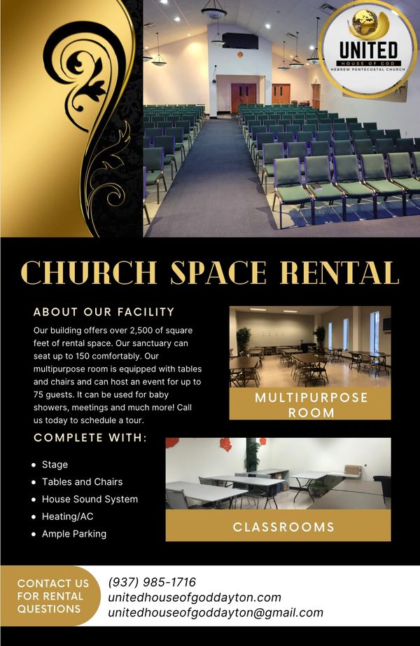 Looking for a space to host a meeting or maybe an event? Well at United House of God, we offer a variety of spaces available for rent such as a multipurpose room, classrooms and sanctuary.